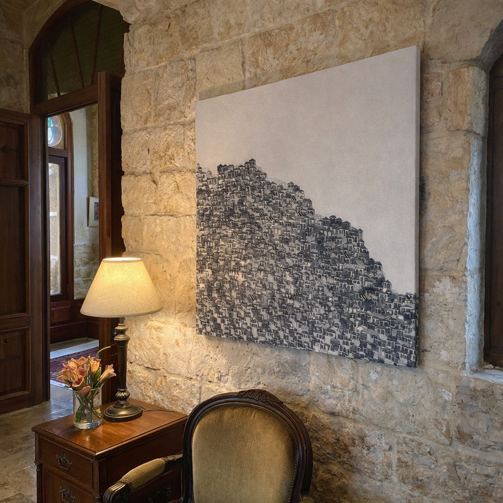 Amalfi is a one-of-a-kind original artwork by Talya Nasser, created using fine tip pen on a 60x60cm canvas. This black and white drawing intricately captures the stacked architecture and natural beauty of the Amalfi coastline, weaving together detailed lines that bring the chaotic harmony of this iconic landscape to life. Every detail is hand-drawn with precision, making this piece a unique blend of nature and structure, impossible to replicate.